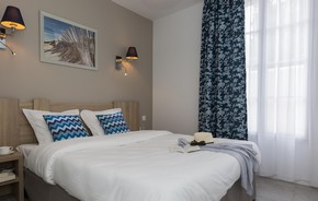 Appartement 2 pièces 4 personnes climatisé (env. de 36 à 38 m²) : Séjour avec 1 canapé lit. Chambre avec 1 lit double. Salle de bain avec baignoire (ou douche dans appartement pour PMR) et sèche-cheveux. Kitchenette équipée avec lave-vaisselle, ménagère complète, plaques de cuisson, micro-onde (option grill), réfrigérateur avec congélateur, bouilloire, cafetière et grille-pain.